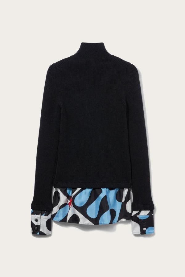 Designed to look like a sweater layered over a satin-twill shirt, this hybrid piece elevates the notion of casual knitwear. The Leocorno-print cuffs and hem add an energetic Pucci finish.